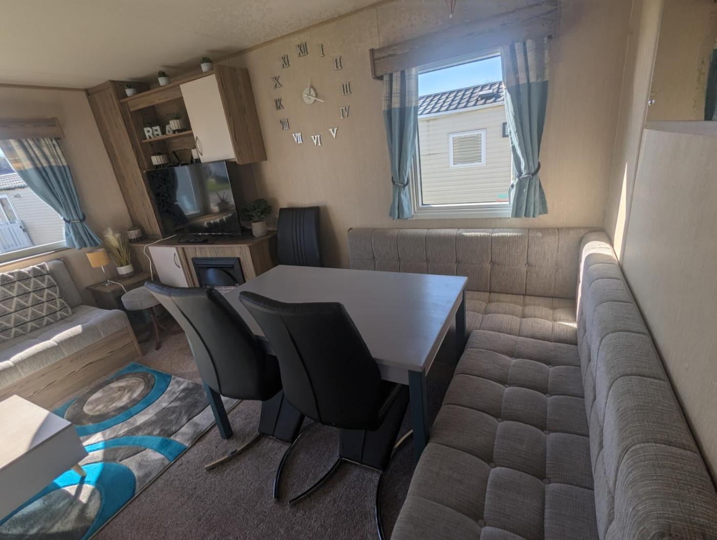 Caravan. The fireplace is the standout feature of this mobile home. Boasting a private entrance, this mobile home features 1 living room, 3 separate bedrooms and 1 bathroom with a shower and a hairdryer. The fully equipped kitchen has a stovetop, a refrigerator, kitchenware and an oven. The mobile home features a flat-screen TV with streaming services, a washing machine, a tea and coffee maker, a seating area as well as sea views. The unit has 6 beds.